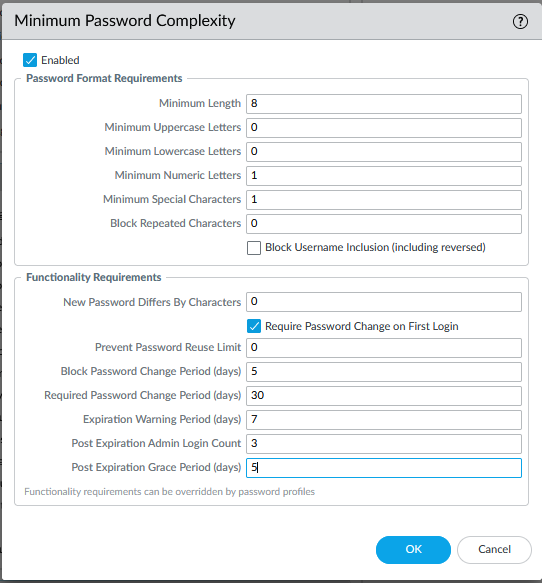 I firewall Palo Alto Networks prevedono la possibilità di definire le caratteristiche di complessità per le password degli amministratori locali dei dispositivi, come anche la durata minima e massima di una password e il grace period per le password scadute.