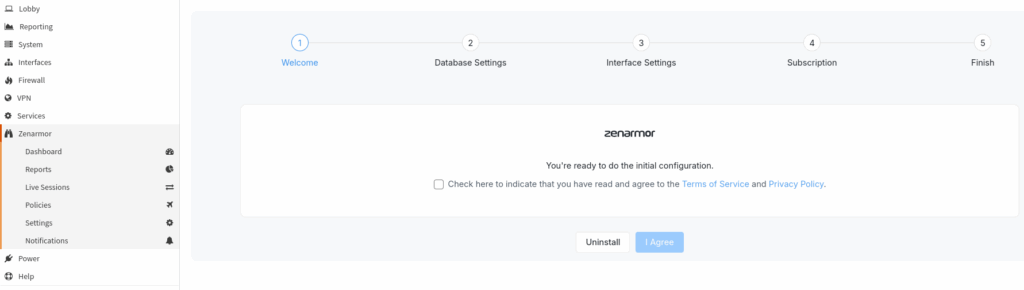 Just click on Zenarmor from OPNsense main menu, and you’ll be provided with the initial configuration wizard.