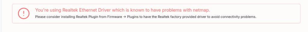 Il wizard su OPNsense mi propone di default la terza opzione, mentre sul sito di Zenarmor la scelta predefinita è quella con driver nativo. La questione del driver dipende molto dall’hardware delle schede di rete presenti sul dispositivo. La mia APU utilizza schede di rete RTL8111E, che in teoria sono supportate, tuttavia ottengo il seguente avviso: