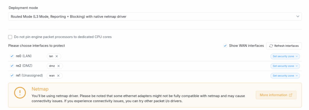 Sistemata la questione driver, riavviato il dispositivo e tornati al wizard di configurazione di Zenarmor, è giunto il momento di scegliere le interfacce da proteggere, assegnandole alle corrispondenti security zone. Si possono usare le security zone predefinite (lan, wan, dmz, ecc.), oppure si possono definire delle zone custom. Nella mia configurazione ho tre interfacce, che assegno rispettivamente alla lan, alla dmz e alla wan.