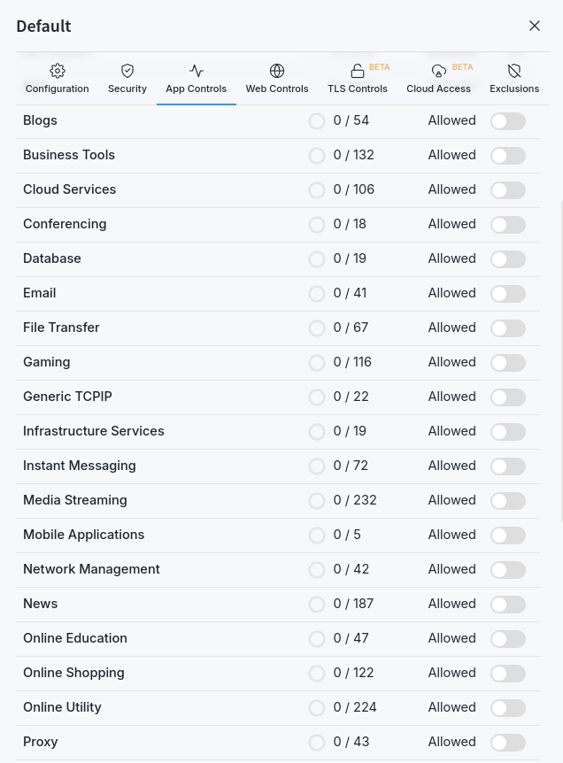La tab “App Controls” consente di controllare quali applicazioni consentire oppure bloccare; le applicazioni sono classificate per categorie, consentendo quindi di permettere/bloccare intere categorie oppure le singole applicazioni in esse contenute.